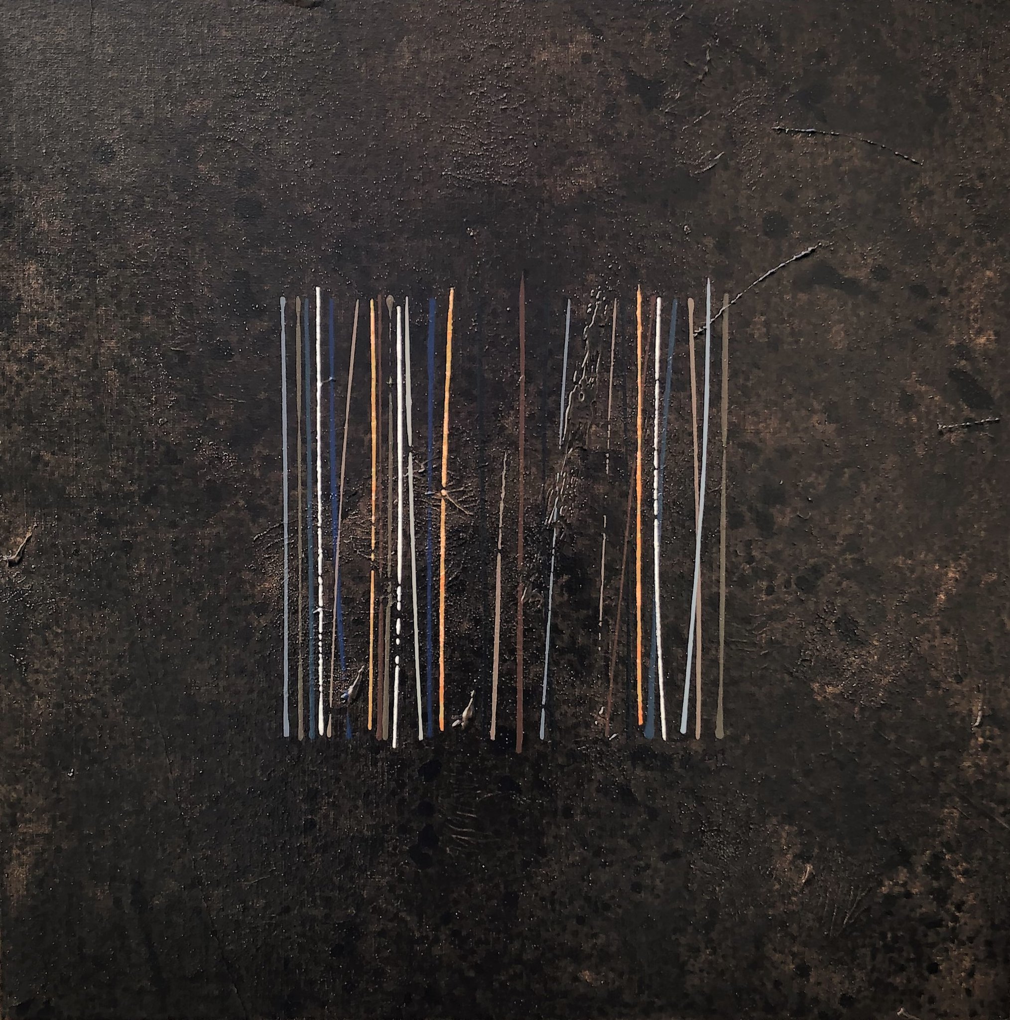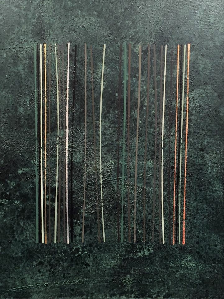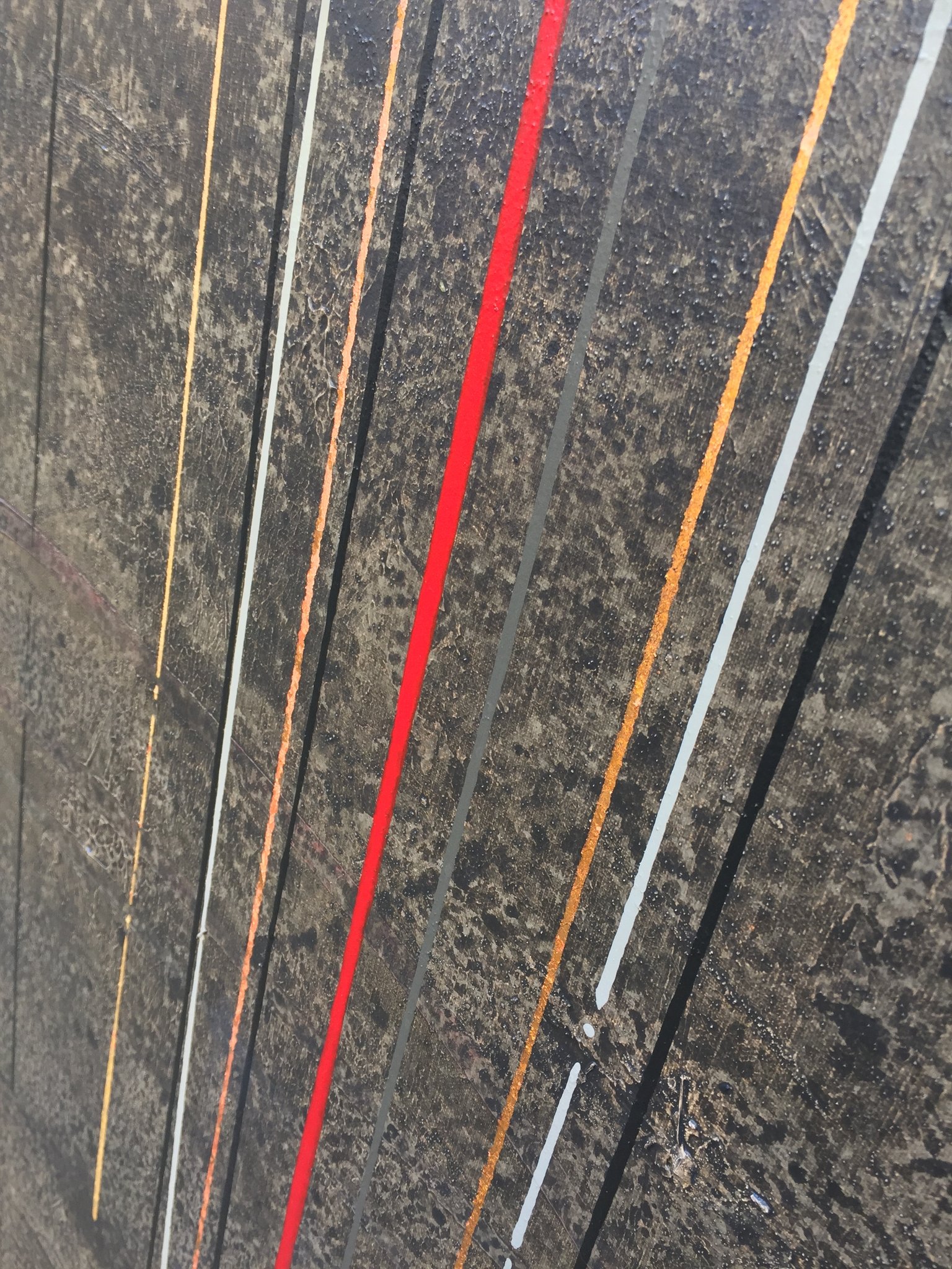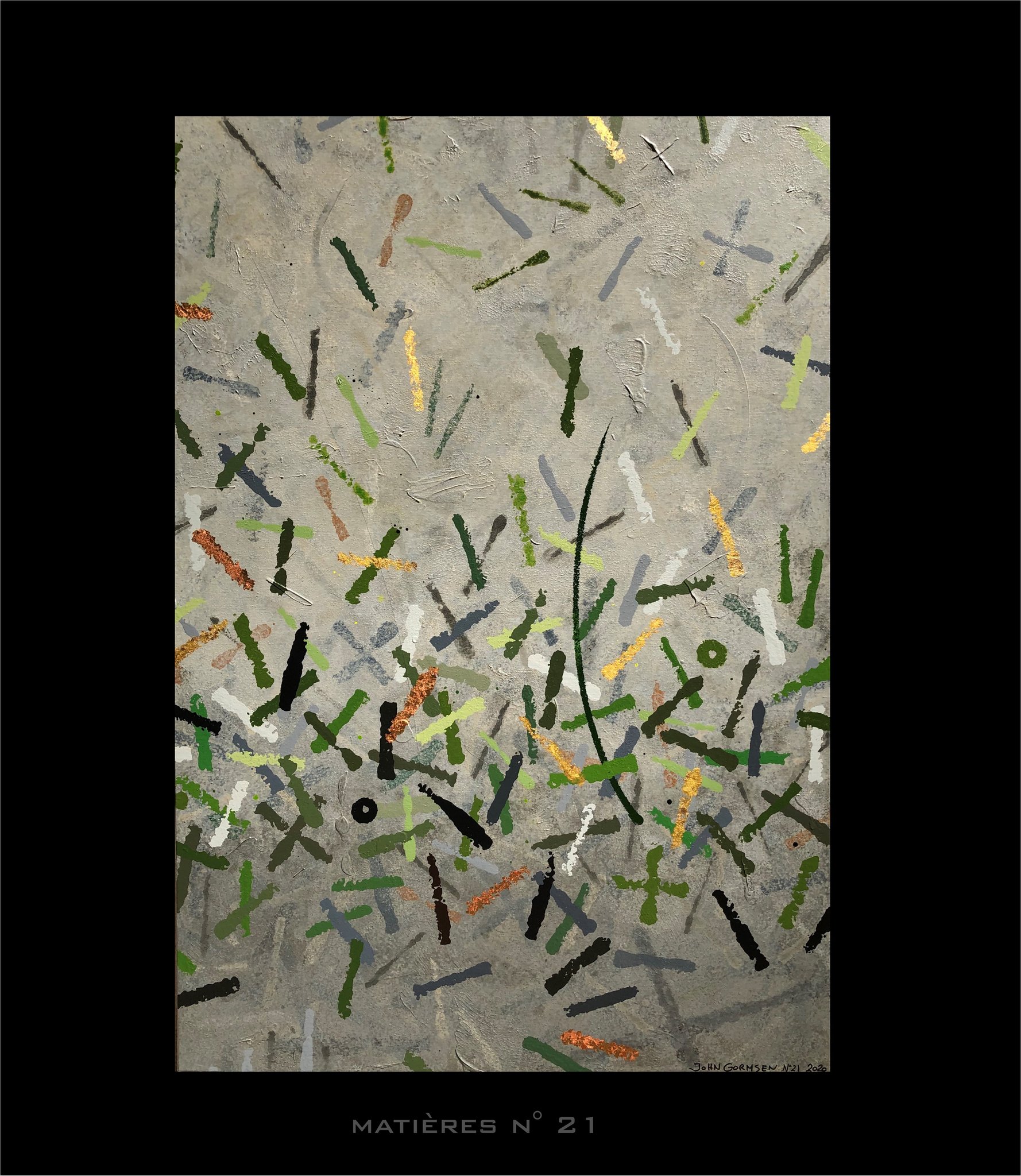 Le tout présenté sur 30 couches fluidifiées et superposées de pigmentation et d'encres. entre les couches des matières végétale et minérale